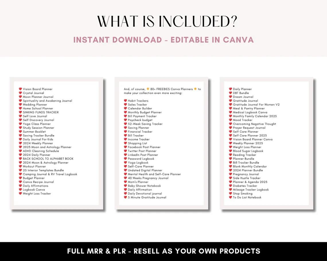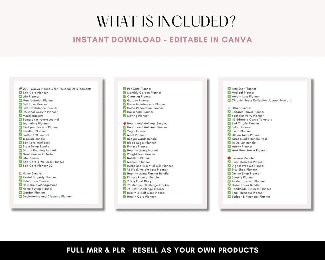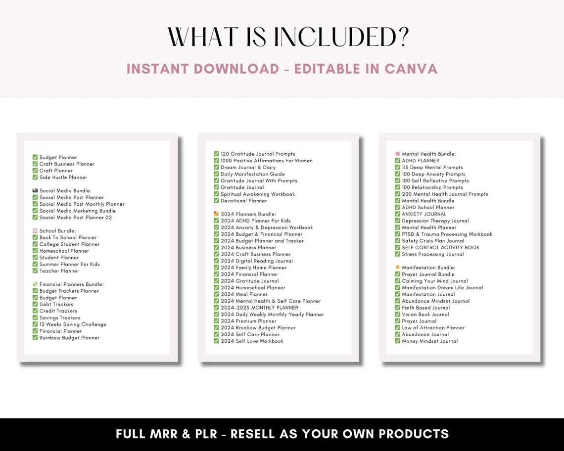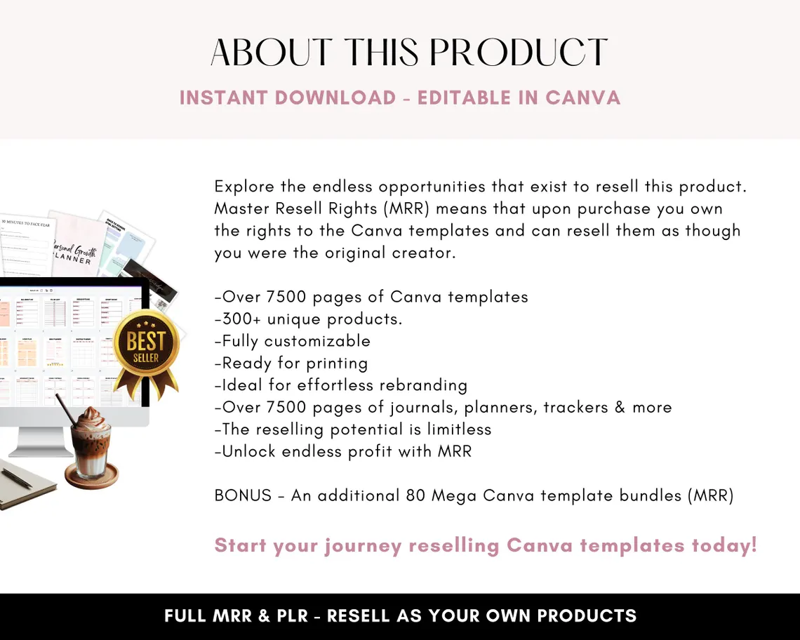 Transform your digital products business with this Mega Bundle of 300+ Canva PLR templates, featuring 7500+ editable pages across multiple niches. Created for effortless resale, each template comes with Master Resell Rights (MRR) and Private Label Rights (PLR), allowing you to modify, rebrand, and resell for full profit. Whether you’re looking to create unique printable journals or expand your planning template inventory, this bundle has it all!