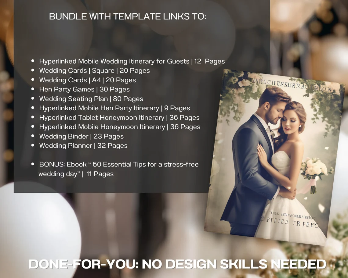 Included is an exclusive 11-page eBook titled “50 Essential Tips for a Stress-Free Wedding Day” – the perfect addition to guide couples through every stage of planning and executing a dream wedding.