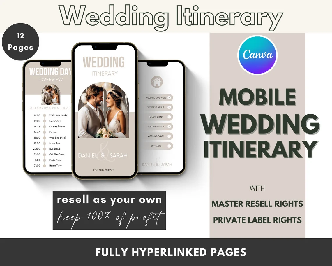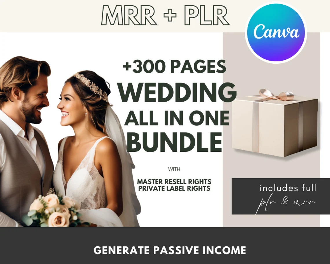Elevate your passive income strategy with our All-in-One Wedding Bundle! This wedding planning toolkit is packed with 300+ pages of beautifully designed, hyperlinked itineraries, planners, wedding cards, and games – all customizable on Canva and licensed with Master Resell Rights (MRR) and Private Label Rights (PLR). From wedding prep to honeymoon itineraries, this bundle has everything you need to support couples and capitalize on the wedding market’s high demand for digital resources.