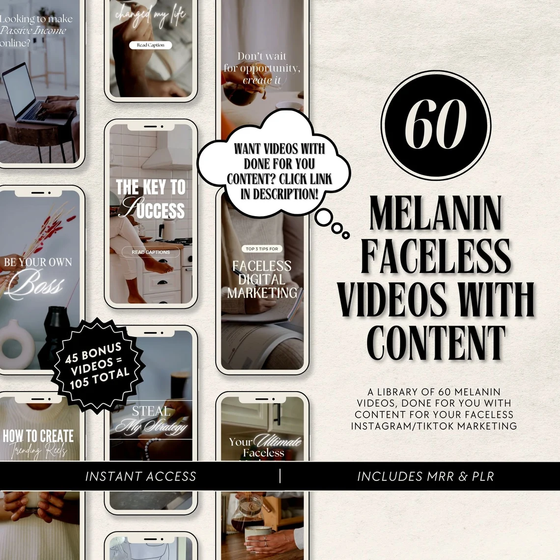 Our Melanin Faceless Video Reels Bundle includes 105 high-quality, melanin lifestyle videos designed for faceless digital marketing. Instantly enhance your social media with these aesthetic reels, paired with 30 bonus videos featuring hooks and calls to action. With Master Resell Rights (MRR) and Private Label Rights (PLR), this bundle is ideal for branding, reselling, and building a passive income stream.