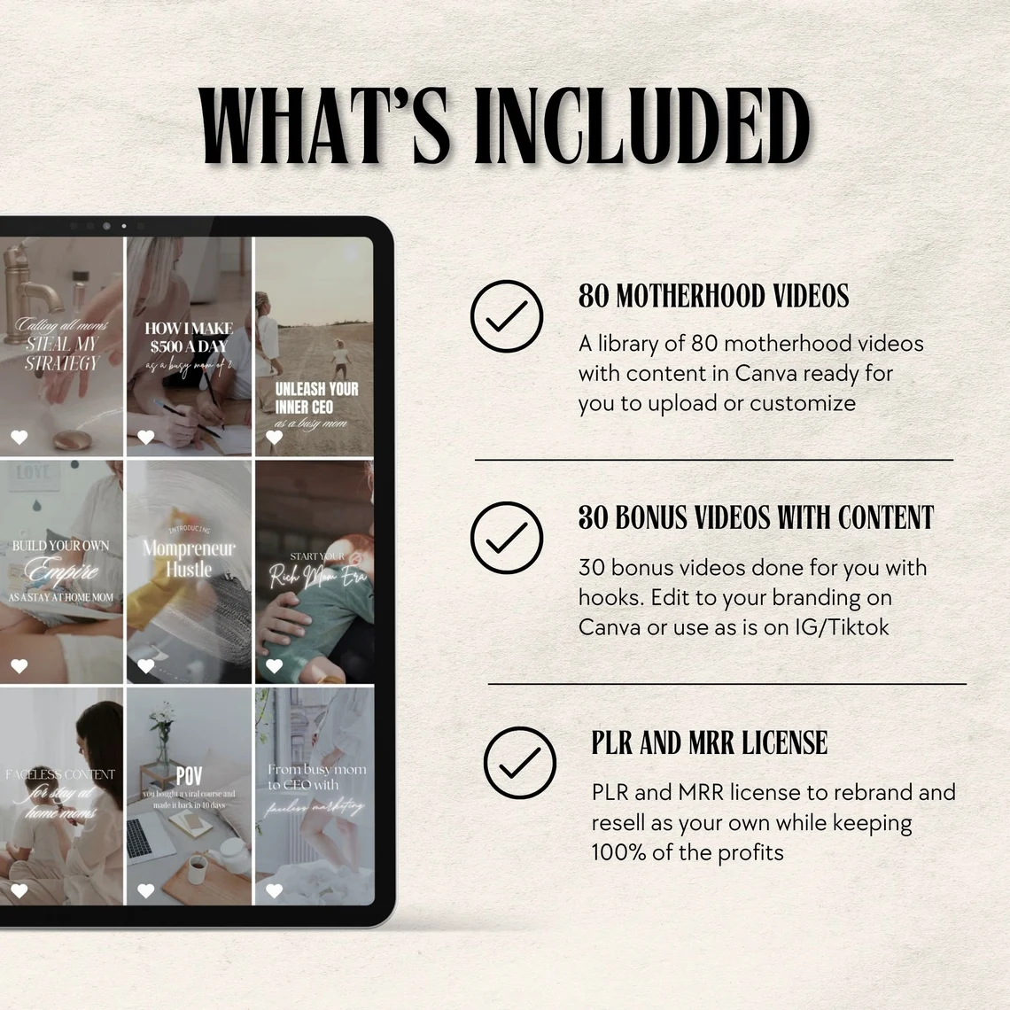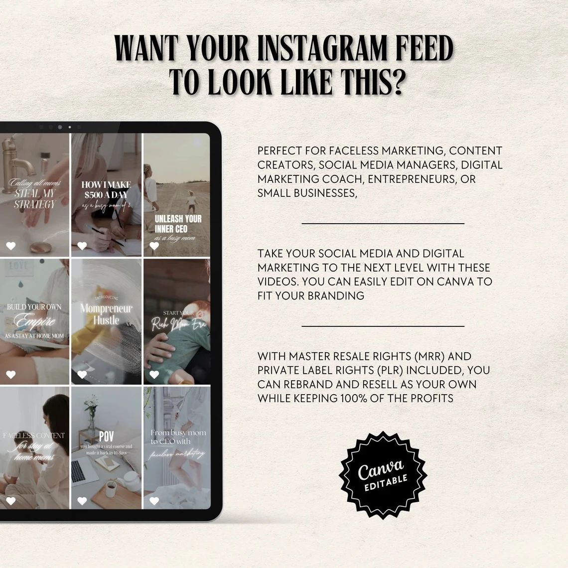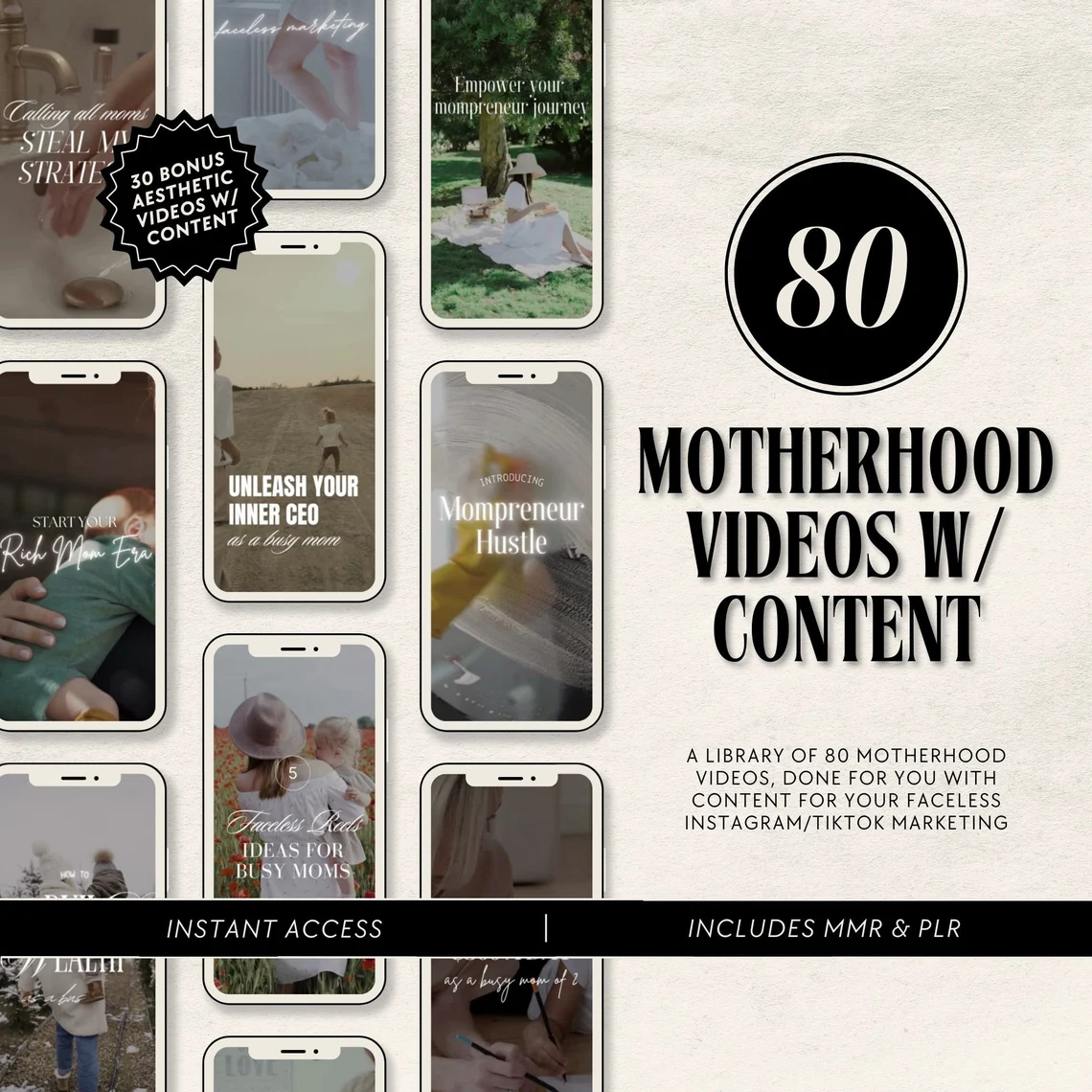 Get 80+ motherhood faceless reels with MRR/PLR rights. Boost your Instagram presence with Canva templates. Start earning passive income now!